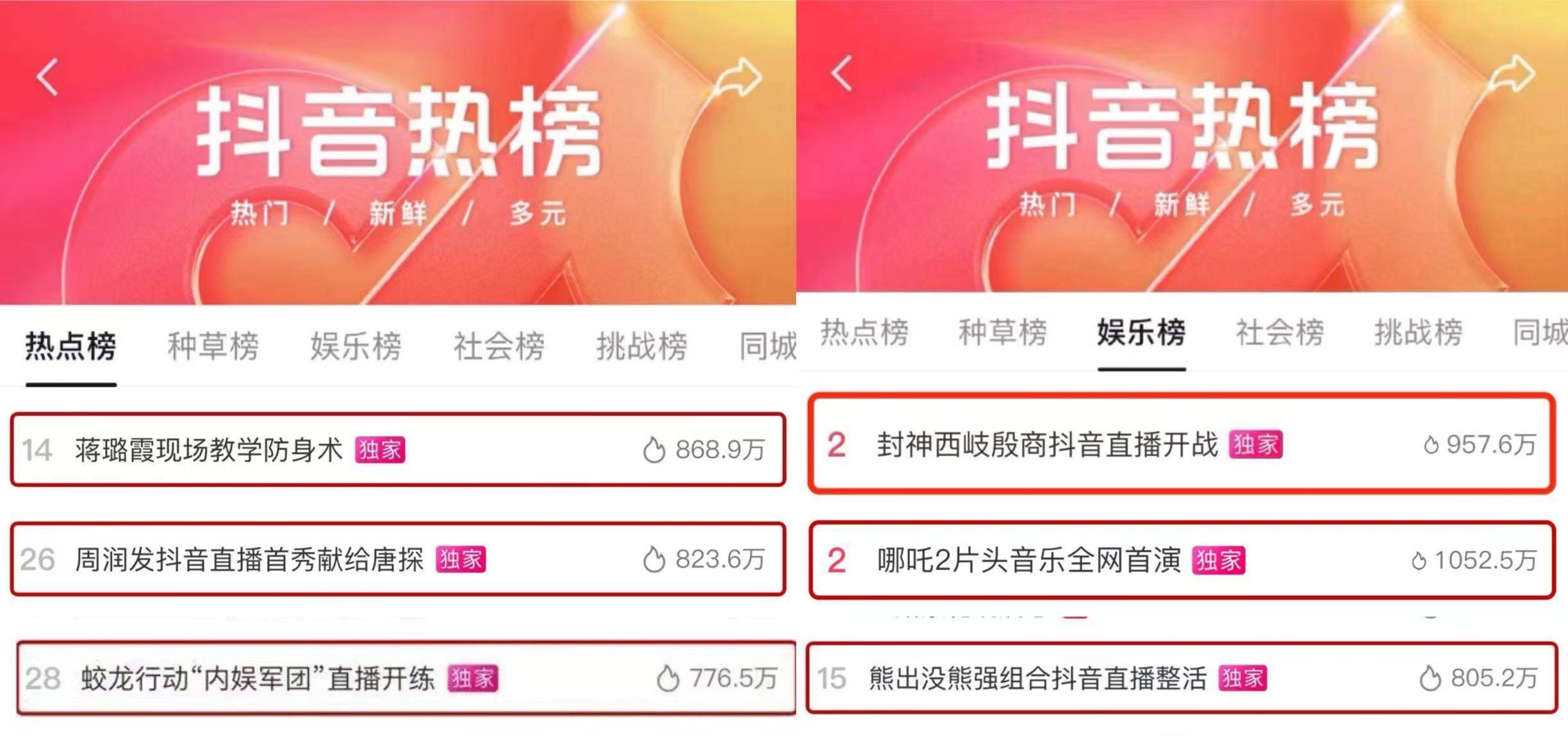 精彩的直播环节得到了大家的热情关注,#熊出没熊强组合抖音直播、#蒋璐霞现场教学防身术、#哪吒2片头音乐全网首演、#周润发抖音直播首秀献给唐探、#封神西岐殷商抖音直播开战 等直播相关话题词迅速登上站内热榜,累计收获3个抖音热点榜与16个抖音娱乐榜,在映前助力春节档电影热度持续攀升。