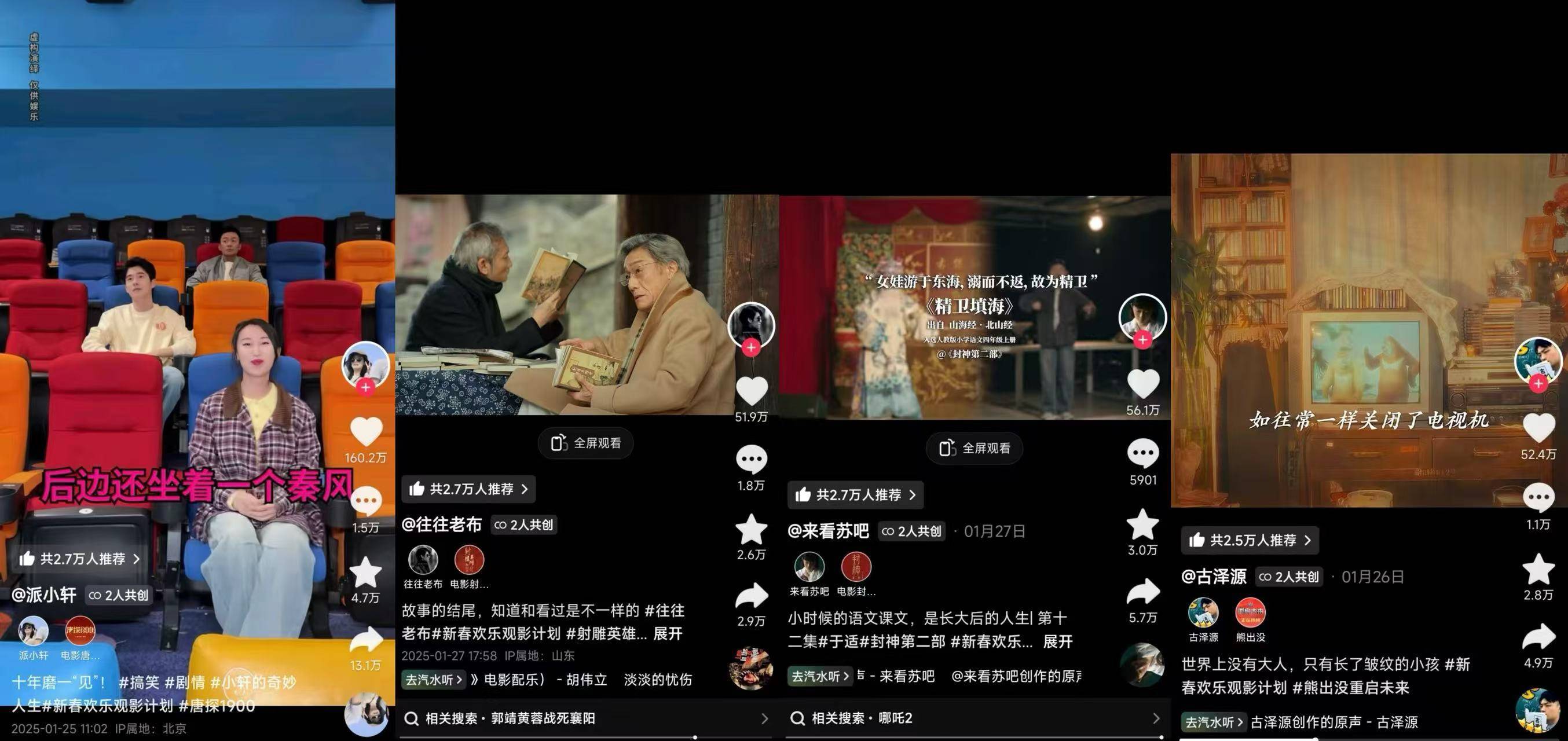 这些共创短片将电影IP融入生活场景,用幽默、情怀与温情等情绪打动用户,收获总播放量超2.4亿,点赞量1145万+,单条视频点赞量均超过了50万(数据截止2月5日)诠释了"一部电影,千万种打开方式"。不仅将电影内核与观众情绪紧密连接,更带动用户二创,反哺影片热度,形成"用户种草--观影--二次创作"的正向循环。在抖音,电影从不散场,每个人都是续写故事的导演。