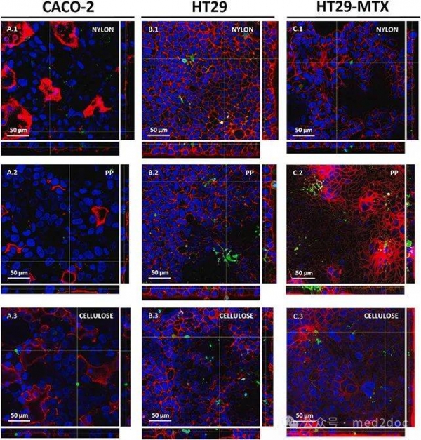 最令人担忧的发现是,研究人员还测试了这些微塑料颗粒如何与人体的肠道细胞互动。结果显示,在产生粘液的肠道细胞中,微塑料颗粒的吸收量足以让它们进入细胞核--这对健康影响的评估非常重要。