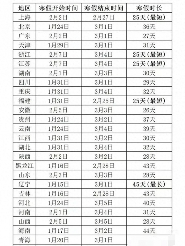 而华东地区的寒假则显得"紧凑"许多:上海2月2日放假,2月27日开学,仅25天;浙江、江苏同样是2月7日放假,3月4日开学,也是25天;福建虽然1月31日就放假,但2月25日就结束,依旧没逃出25天的"最短阵营"。就连华南的广东,2月2日放假3月1日开学,也只有27天,比东北少了近一半。
