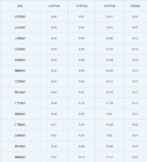 来宾:92号8.59,95号9.08,98号10.08,0号8.24。
