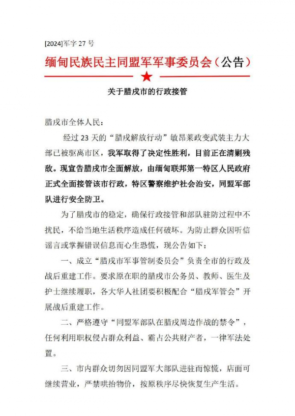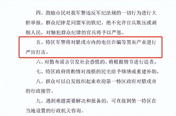 果敢军彻底控制了腊戍地区后,做的第一件事就是发布告示,安抚当地民众,果敢同盟军的军事行动不会干扰当地民众的正常生活、工作秩序,请他们放心。在公告的第5条,果敢军才透露了这次行动的真实目的:将对腊戍市内电信诈骗等黑色、灰色产业进行严厉打击。