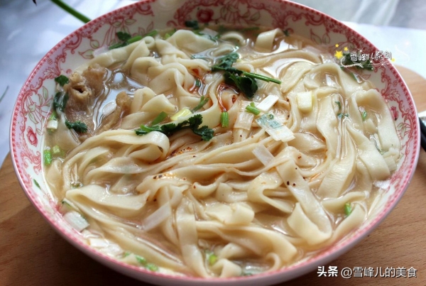 1,面粉中加入淡盐水和成硬一些的面团,静置一会儿揉匀用大擀面杖慢慢擀成又大又薄的面片,折叠切成面条煮熟。