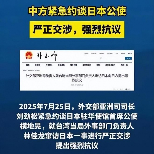 7月25日,中国外交部紧急约见日本公使,就台湾外事部门负责人林佳龙窜访日本提出严正交涉,这正是对日本危险行径的明确警告。