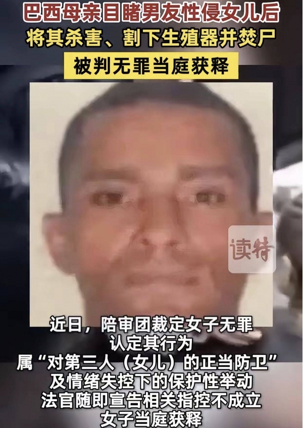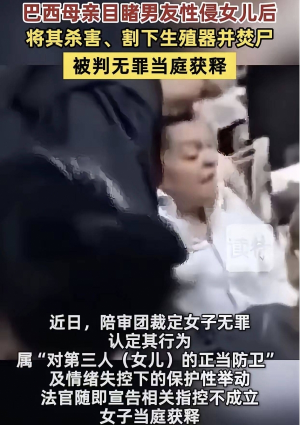 近日巴西一起案件引发全网震动:一名母亲目睹男友试图性侵自己的女儿,当场将男友捅死,随后割下其生殖器并焚尸。最终巴西陪审团裁定该母亲"无罪",当庭释放--法院认定她的行为属于"对正在发生的暴力侵害进行正当防卫"。