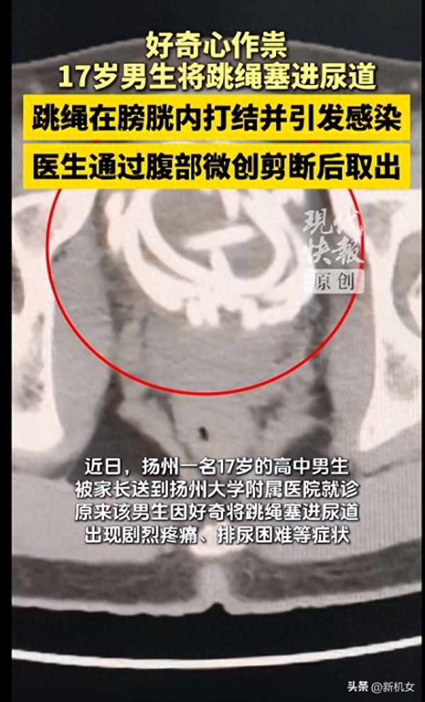 手术台上,医生看着屏幕倒吸一口凉气--一根橡胶跳绳在膀胱里盘成一团,死死打结,周围黏膜布满脓苔。这个17岁男孩,因为一时好奇,把跳绳塞进了尿道,结果再也取不出来。