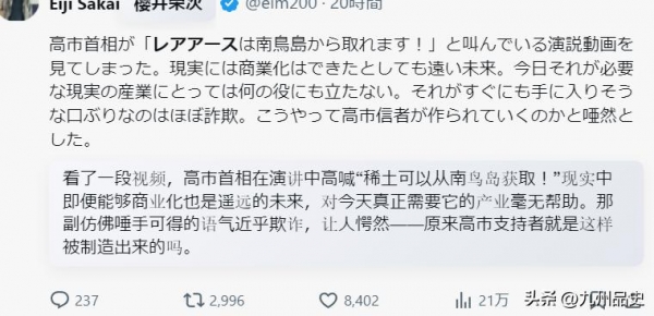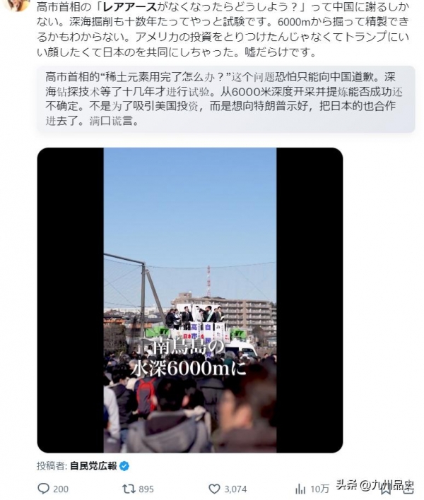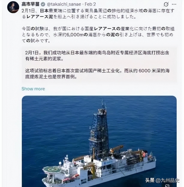 日本在外交上因为高市早苗的激进路线陷入被动,稀土供应面临前所未有的压力,产业界人心惶惶。这个时候,把一个2012年就发现的海底稀土矿翻出来重新炒一遍,配合"全球首次深海试采"的噱头,通过媒体大规模渲染,营造出"日本即将稀土自主"的假象,目的无非是安抚国内情绪、给选举造势、对外表演"底气"。