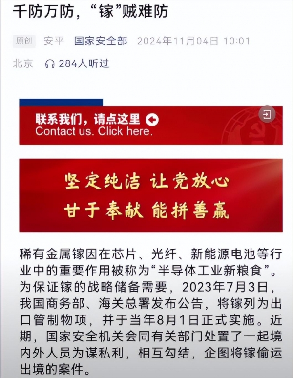 可这一管制,让一些境外组织着急了,在11月4日,国家安全机关会同有关部门处置了一起境内外人员,为谋私利,互相勾结,企图偷运金属镓出境的案件。