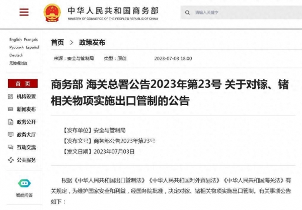 去年,商务部和海关发布对镓等稀有金属的出口管制