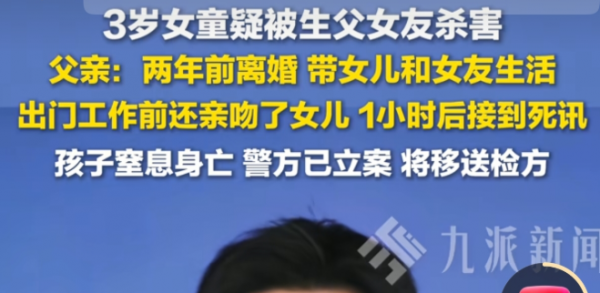 江苏,怀孕女友嫉妒男友对亲生女儿太好,用手将其3岁女儿活活捂死,却对男友谎称是其女儿自己玩塑料袋不慎窒息而死的。男子心生怀疑,之后女友被警方锁定为嫌疑人并被刑拘,此案已被立案侦查,近期将移送检方。网友:嫉妒使人面目全非!