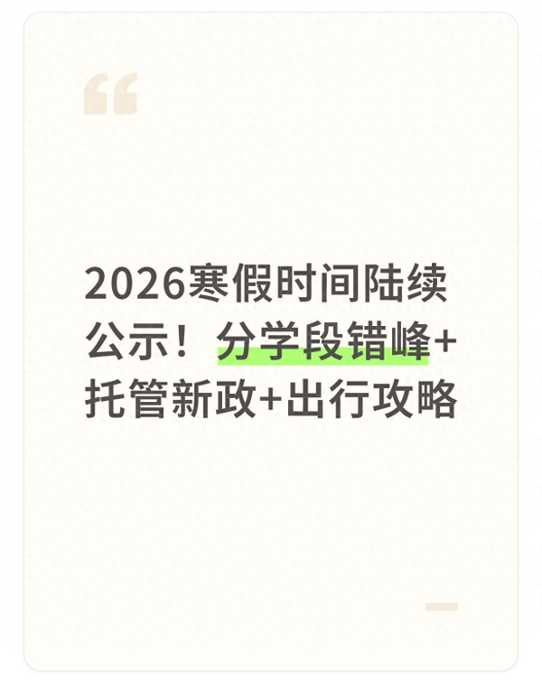 目前距离各地寒假开启仅剩1至2个月,后续各地教育局将陆续公示寒假具体起止日期,托管班报名、出行预订、兴趣班选择等事宜均可提前筹备,提前摸清政策规律与时间节点,既能让孩子度过一个平安、充实、快乐的假期,也能减少家长临时筹备的压力。寒假不仅是孩子休息放松的时段,更是亲子陪伴、成长提升的重要契机,合理规划、科学安排,才能让假期更具意义。