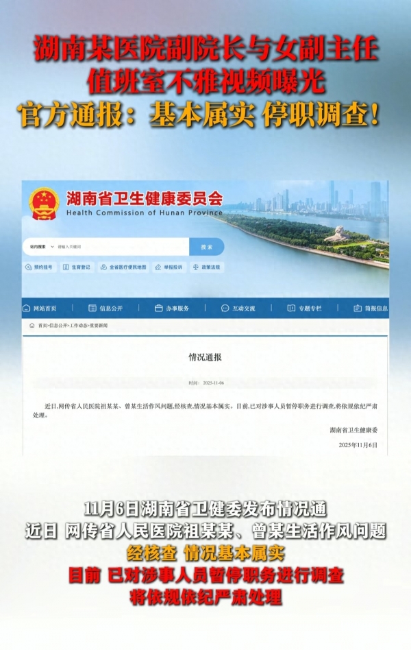 "三甲医院副院长与眼科副主任工作时间在值班室发生不正当关系"--一则附带不雅视频的爆料近期在社交平台持续发酵,涉事医院为湖南省某大型三甲医院,爆料中提及的副院长祖某某、眼科副主任曾某均为主任医师、博士生导师,学术光环加持下的"精英人设"与网传画面形成强烈反差,迅速引发全网热议。11月6日,湖南省卫生健康委员会发布官方通报,明确"经核查,网传情况基本属实",已对两人作出暂停职务处理,后续将依规依纪严肃追责。