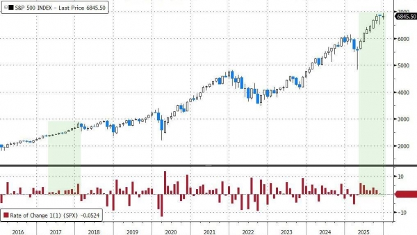 纳斯达克100指数(NDX)全年大涨21%,标普500指数录得18%的总回报(含股息),道琼斯指数与罗素2000指数分别上涨15%和13%。标普500甚至以一波罕见的"8个月连涨"收官,这是自2017年以来未曾有过的强势表现。