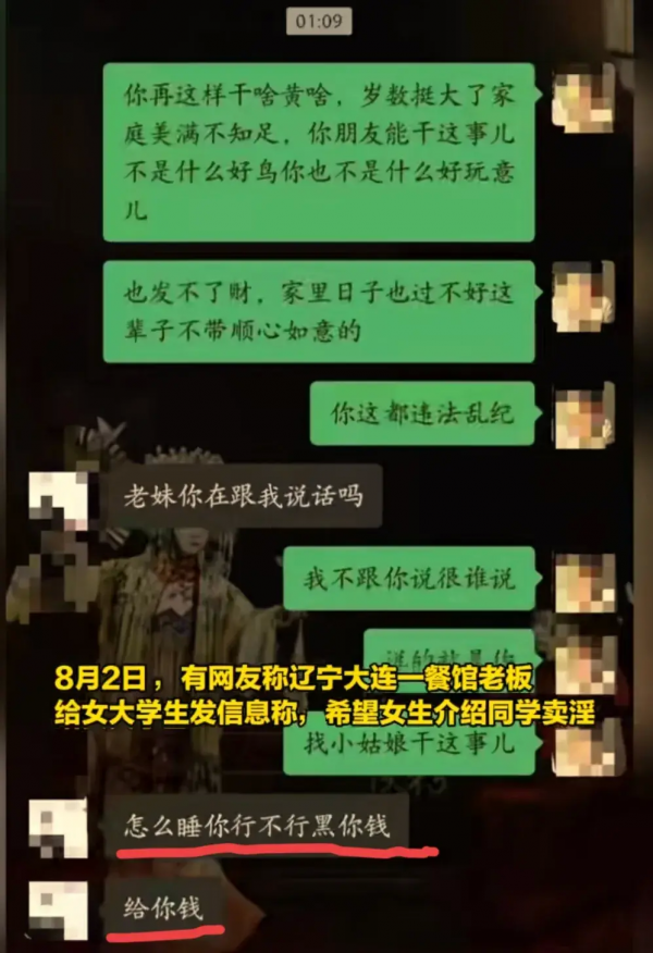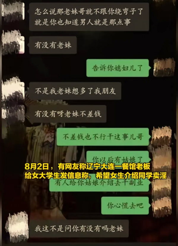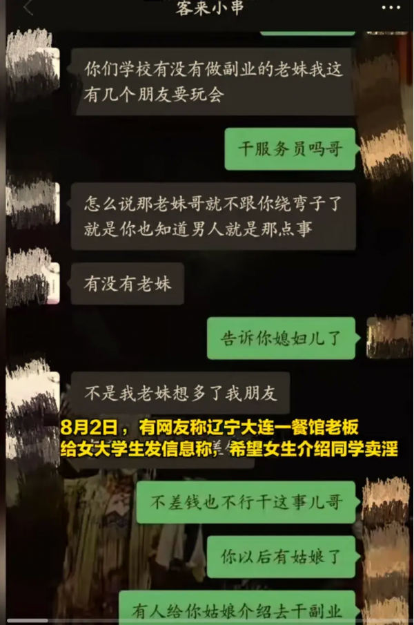 8月2日,新京报曝光一起令人震惊的事件--大连一餐馆老板竟然让女大学生介绍同学从事不当交易!聊天记录中露骨的言辞引发公众关注!