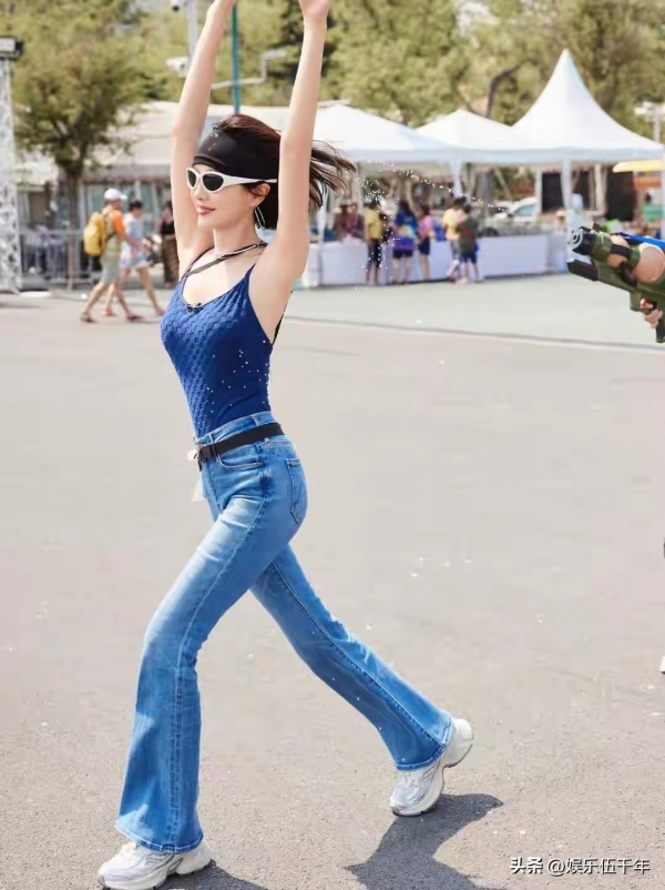 先来看看这身让人眼前一亮的造型!藏蓝色吊带搭配紧身喇叭牛仔裤,既显瘦又高级,把秦岚的好身材展现得淋漓尽致。最绝的是湿身之后,衣服贴身勾勒出的曲线简直绝了,这腰臀比真的让人羡慕到哭!