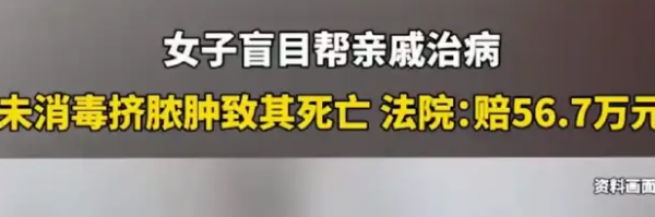 吉林临江,女子回老家探亲时,得知亲戚有腿疾,女子表示自己能治,经过一阵推拿揉搓,亲戚腿上出了个大脓肿,女子在没消毒的情况下挤破脓肿,导致亲戚血液感染,最终因多器官功能衰竭而亡。案发后亲戚家属不干了,先是报了警,后又起诉索赔。