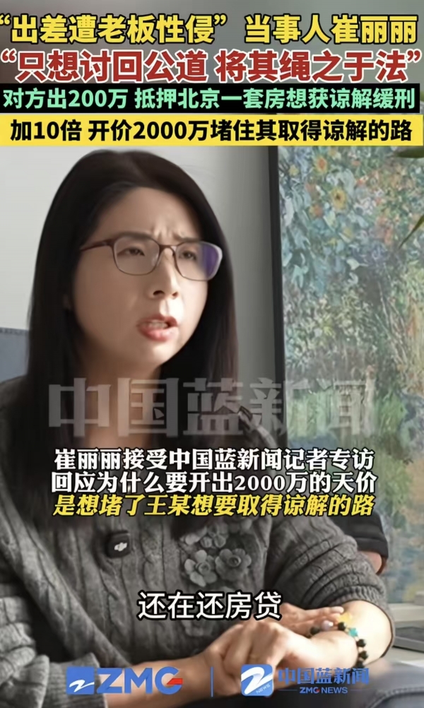 对此崔丽丽给出的回应是:"2000万加法办。"她后来解释说,她开出这个对方根本不可能接受的数字,并不是为了要钱,而是用这种强硬的方式表明:自己不接受私了,这事儿必须走法律程序,让对方承担刑事责任。
