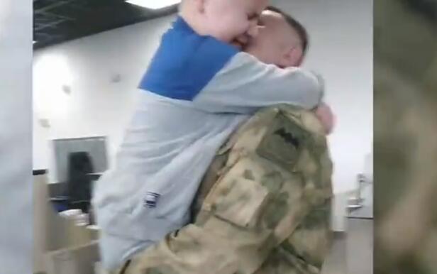 在哈巴罗夫斯克,一名男孩哭着抱住了他许久不见的父亲。