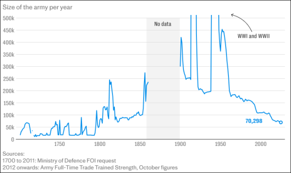 1700年至2025年英国军队规模趋势变化图 《每日电讯报》制图