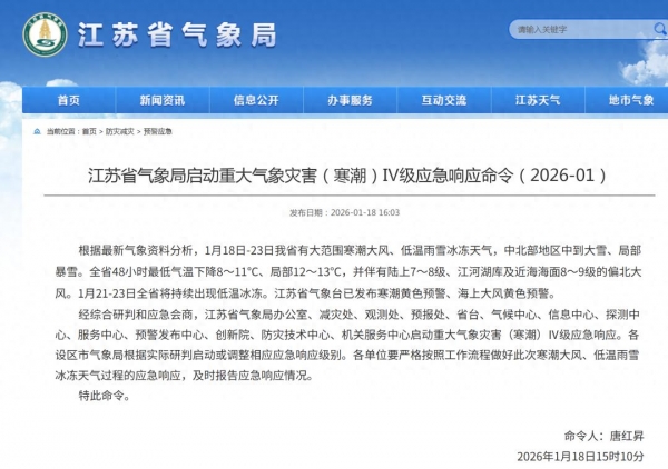 1月18日,江苏省气象局启动重大气象灾害(寒潮)Ⅳ级应急响应命令: