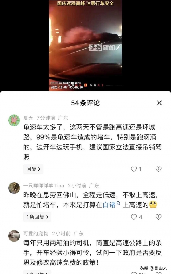 同时,它会人为制造拥堵,国庆返程高峰的广昆高速本就车流密集,"龟速车"带来的通行效率下降,让西江大桥等路段出现3小时滞留的情况。更危险的是,低速行驶易引发"路怒",一些后车司机的报复性驾驶行为会让风险加倍升级。