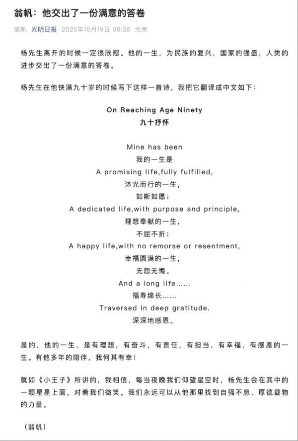 杨先生离世的时间是10月18日中午12:05,消息确认后,清华大学有关方面随即发布消息。