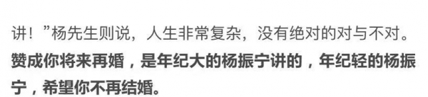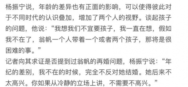 他也公开谈论过翁帆再婚的问题,他不反对翁帆在他离世后结婚,"人生非常复杂,没有绝对的对与不对,年轻的杨振宁,不希望翁帆再婚,但年纪大的杨振宁会赞成的。"