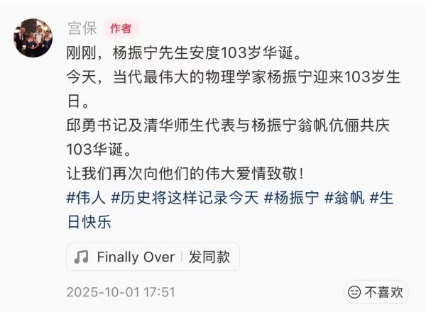10月1日,杨先生过103岁生日时,其好友王征发布了一张现场照。