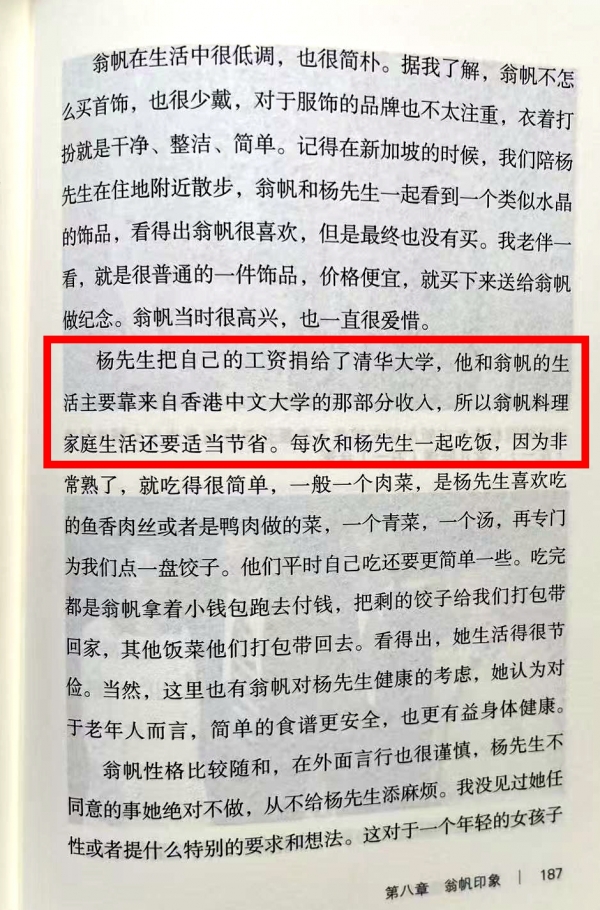 在朋友眼中,杨振宁夫妇过得很节俭,出外用餐从不浪费,就点两三个菜。