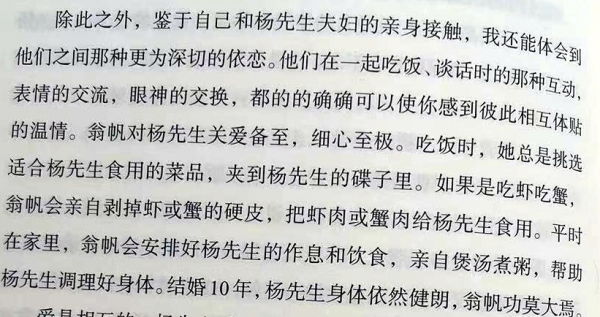 但翁帆认为,过去20年,她与丈夫是相互陪伴,她照顾杨振宁的同时,对方也在关爱着她。