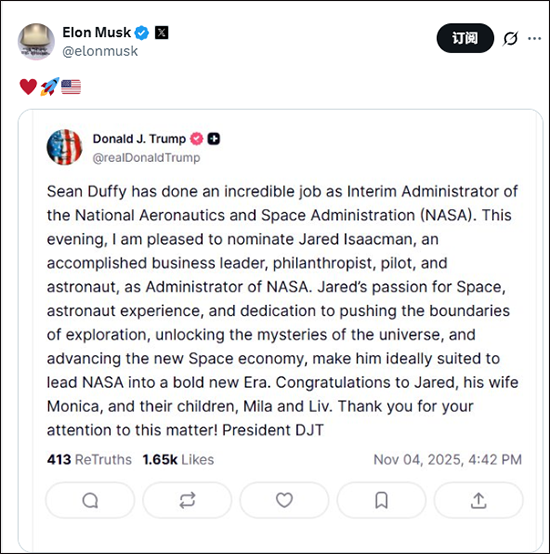 但达菲的计划没能赶上特朗普态度的缓和,今年9月,有媒体拍到特朗普与马斯克在查理·柯克(Charlie Kirk)的追悼会上同框出现,并握手交流,显示二人关系有所回暖。事实也确实如此,美国多家媒体报道称,随着马斯克与特朗普关系回暖,艾萨克曼似乎也逐渐重新进入了NASA局长提名的讨论中。