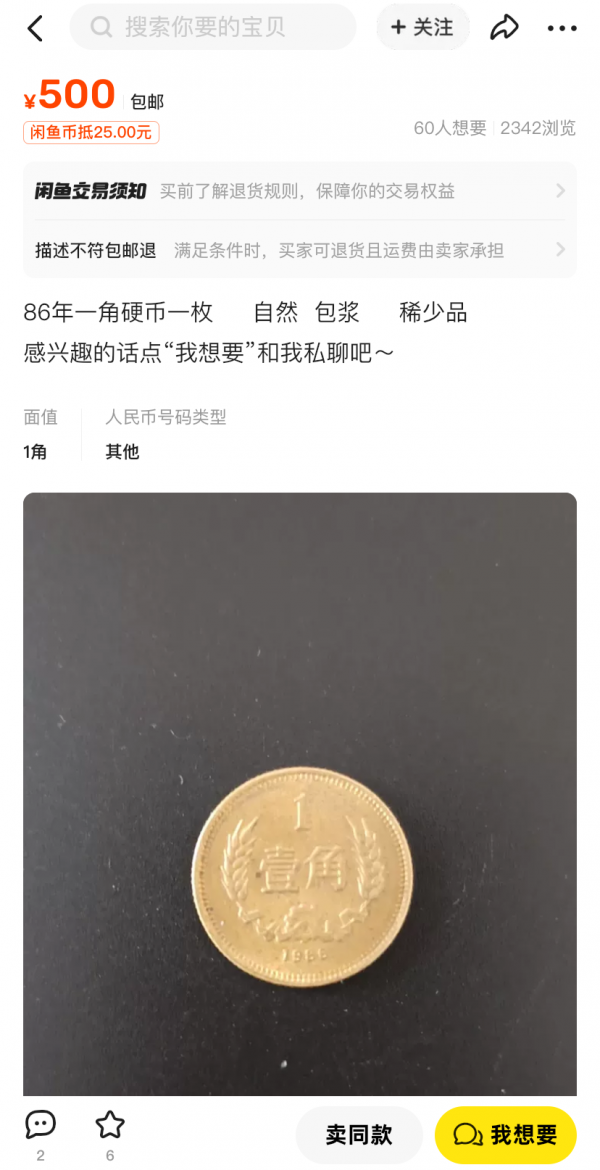 等到平台上一搜才发现,硬币还是那个硬币,只是诸多描述已经变了味道。86年、自然、包浆,标价500,虽然配图没问题,但是仔细一琢磨,就差直接把服务写明白了。