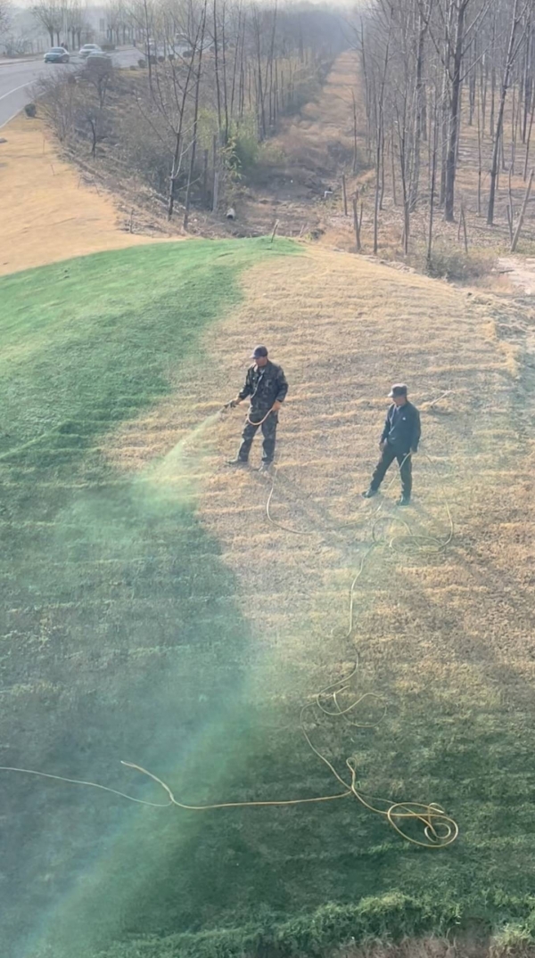 12月10日,陕西一网友拍摄了一段"绿化"的视频引发争议。视频中,两人拿着带有喷头的管子对着草坪喷洒绿色的液体,被喷洒的草坪成了亮眼的绿色,与未被喷洒部分的枯黄色形成对比。