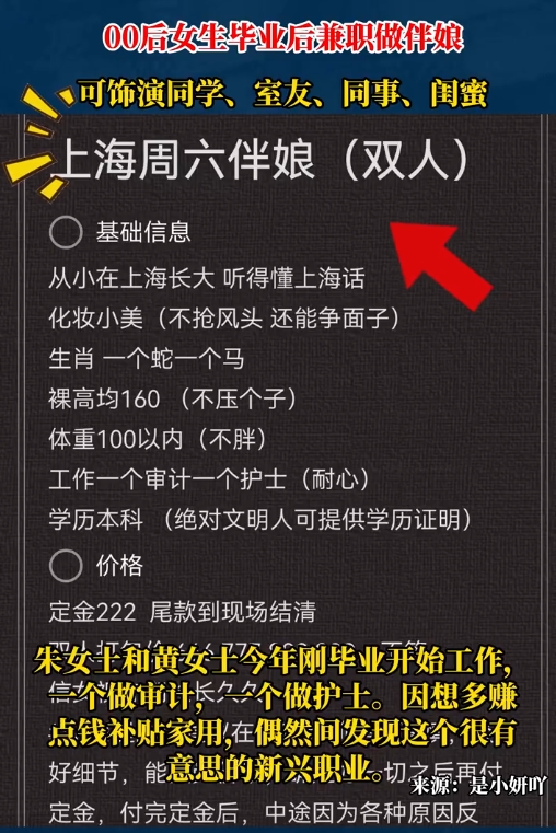 据朱女士介绍,刚写的文案发到社交平台上,第二天就接到了2单请她们去做伴娘的,目前两人打包价格最低666,可饰演同学、室友、同事、闺蜜。