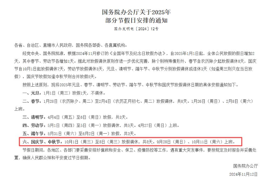 眼瞅着中秋国庆要连休8天假的消息一出来,全网都炸锅了!这可是今年最后一个长假,从9月29号到10月6号,整整8天,不管是想回家陪爸妈,还是带娃出去旅游,都有充足时间。