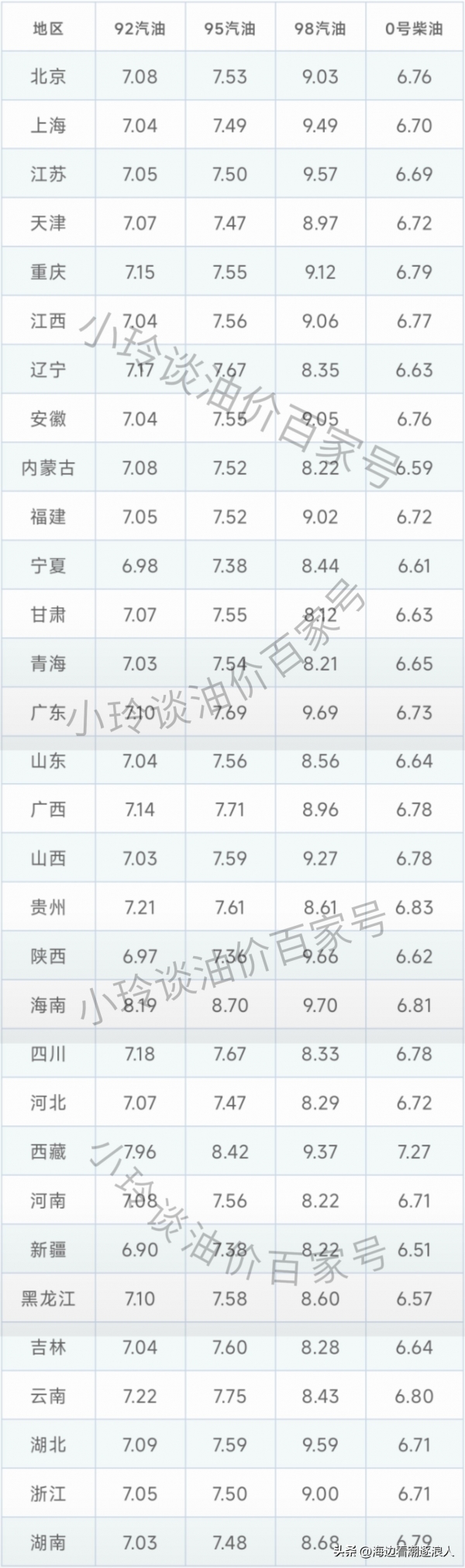 对于黑龙江、云南、陕西、青海、西藏、四川、内蒙古、贵州、新疆等省份的油价没有实行统一价格,这边列出的是省会城市的最高零售价格。