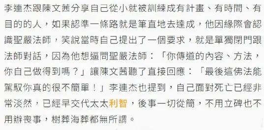 据媒体报道,李连杰近日参加活动,为新书做宣传时接受采访,透露早已看淡生死,并且已经跟妻子利智交代后事,一切从简,不用立碑,也不用办丧事。
