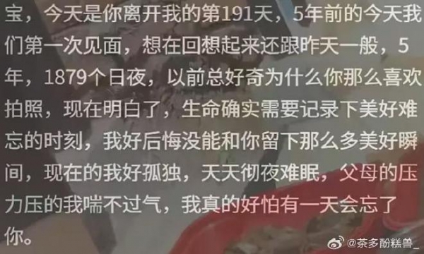 "宝,今天是你离开我的第191天,5年前的今天我们第一次见面,回想起来还跟昨天一般。5年,1879个日夜,以前总好奇为什么你那么喜欢拍照,现在明白了,生命确实需要记录下美好难忘的时刻。我好后悔没能和你留下那么多美好瞬间,现在的我好孤独,天天彻夜难眠。父母的压力压得我喘不过气,我真的好怕有一天会忘了你。"