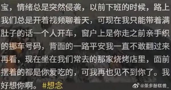 "宝,情绪总是突然侵袭,以前下班的时候,我们总是开着视频聊着天,可现在我只能带着满肚子的话一个人开车,窗户上是你走之前亲手编织的挪车号码,背后的一路平安我一直不敢翻过来再看,现在坐在我们常去的那家烧烤店里,面前摆着的都是你爱吃的,可我再也见不到你了。我好想你啊。"
