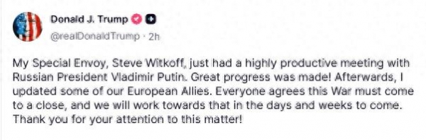 当地时间8月6日,特朗普在其社交媒体"真实社交"发文表示,威特科夫与普京进行了一次富有成效的会谈,并取得了重大进展。