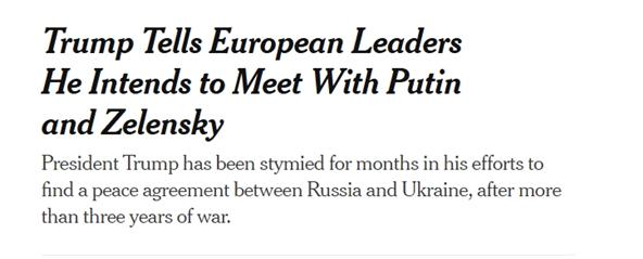 据《纽约时报》6日报道,两位知情人士透露,美国总统特朗普告知欧洲领导人,他计划最早于下周与俄罗斯总统普京进行面对面会晤,随后还计划与普京和乌克兰总统泽连斯基举行三方会谈。