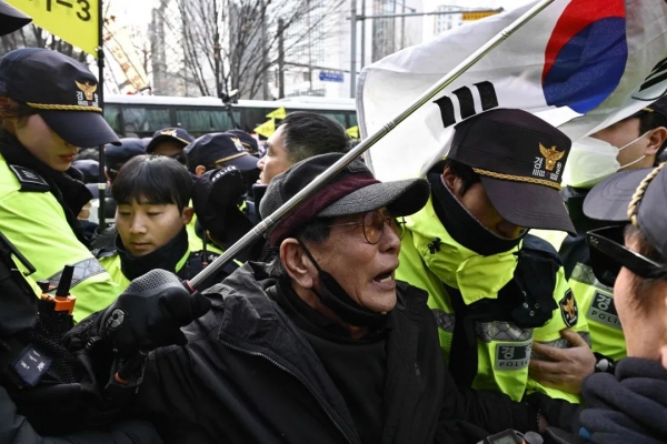 当地时间2025年1月18日,韩国首尔,在首尔西部地方法院外,随着抗议者与警方之间发生冲突,一名总统尹锡悦的支持者情绪激动。视觉中国 图