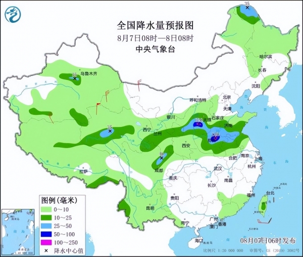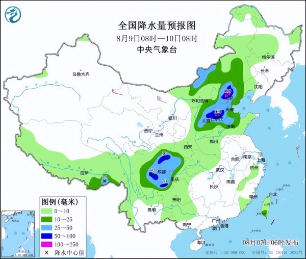 甘肃东部、宁夏、内蒙古河套地区、陕西西部和北部、山西西部及四川盆地西部、河南北部等地部分地区有大到暴雨,其中,内蒙古河套地区等地部分地区有大暴雨(100~130毫米)。上述部分地区伴有短时强降水(最大小时降雨量20~50毫米,局地可超过80毫米),局地有雷暴大风等强对流天气(见图1)。中央气象台8月8日06时继续发布暴雨蓝色预警。