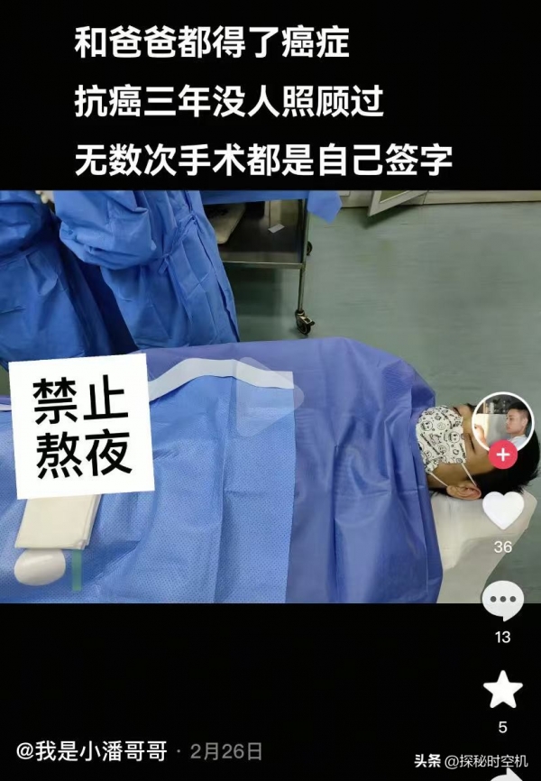 在潘先生的社交媒体账号里,更多的记录来自独自在医院的孤独身影,独自化疗、独自输液……无数次手术都是自己签字!