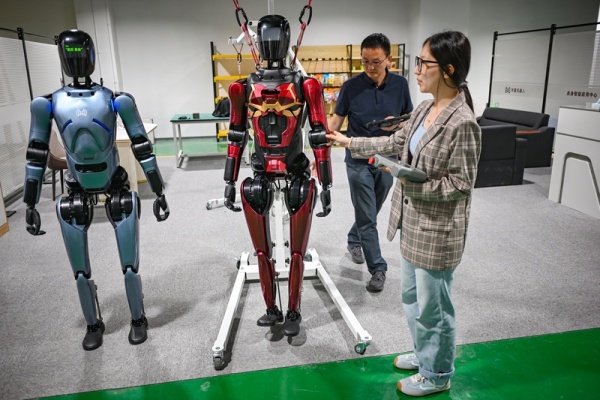 2025年9月22日,江苏南京一家人形机器人整机企业内,工作人员演示人形机器人互动功能。 中新社记者 泱波 摄 IC Photo