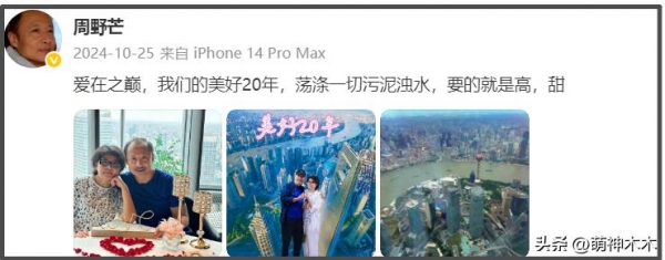 周野芒写道"爱在之巅,我们的美好20年,荡涤一切污泥浊水,要的就是高,甜","爱在之巅"就是夫妇俩的高楼合影,而"荡涤一切污泥浊水"则是直接点明过去被泼的脏水,该微博时间发布在造谣者道歉之后,多少能看出周野芒的委屈。