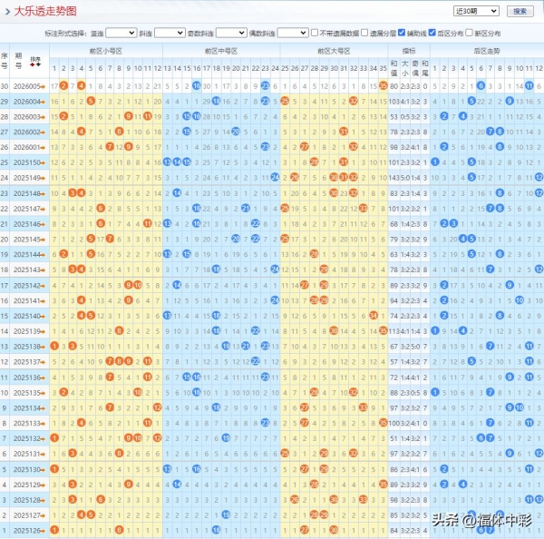 - 上期推荐关注前区开出0个(原推荐17、01、26、34均未出)。