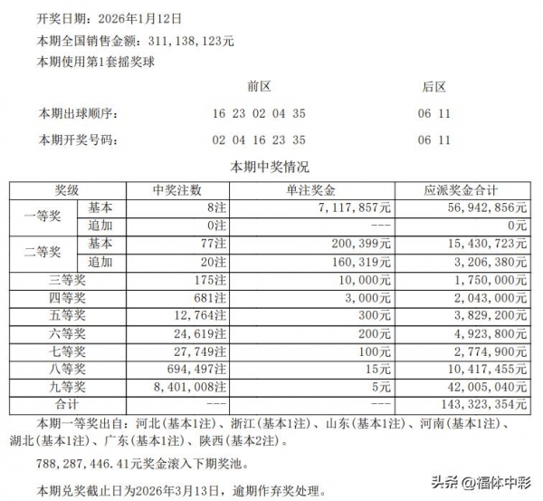本期销售金额3.11亿元,筹集公益金1.0885亿元(按35%公益金比例计算)。周二购彩热度稳步回升,销量较上期(26004期3.05亿元)上涨0.06亿元,无专项促销活动带动,整体走势符合常规规律!本期一等奖迎来新年"好运普惠",共开出8注单注基本奖金7117857元,均未选择追加投注;二等奖共开出77注,单注奖金200399元,其中20注采用追加投注,每注多得16万余元。一等奖中奖地区分布均衡,8注基本头奖分落7省,其中陕西独揽2注,河北、浙江、山东、河南、湖北、广东各揽1注,多地彩友共享开年好运!奖池在本期开奖后滚存至788287446.41元,以7.88亿稳健奖池为1月14日(周三)开奖的26006期续航助力!