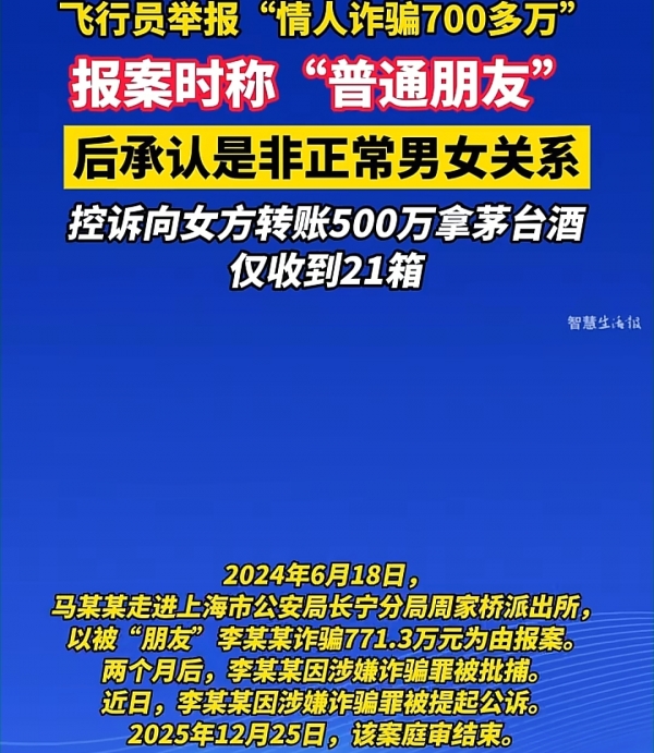 在派出所,马某某的报案的是另一个版本的故事。他隐瞒了两人十余年的亲密关系,只称李某某是"2013年飞哈尔滨时认识的微信好友","一直维持朋友关系"。他将指控的重点,牢牢聚焦在"茅台酒诈骗"上,声称李某某谎称有内部渠道能以1499元的官方指导价大量拿货,骗其转账约500万元,最终却只收到21箱酒。再加上所谓换汇诈骗、叔叔治病借款等事由,总计损失高达771.3万元。
