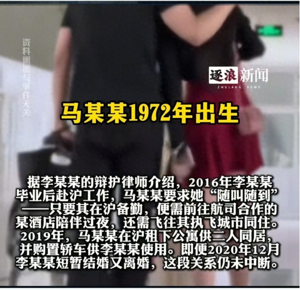 据李某某的辩护律师透露。2016年李某某毕业来到上海工作后,两人的交往变得多了起来。马某某会要求李某某在他于上海备勤时,必须前往航空公司合作的酒店陪伴过夜;有时,还需要她飞往自己执飞的城市同住。到了2019年,马某某索性在上海租下一套公寓,还购置了轿车,弄了一个属于二人的同居世界。即便李某某在2020年底经历了一段短暂的婚姻并迅速离婚,她与马某某之间的联系也从未真正切断。这一切,都有李某某表妹的旁证,她甚至曾陪同表姐去扬州探望过这位"老马"。